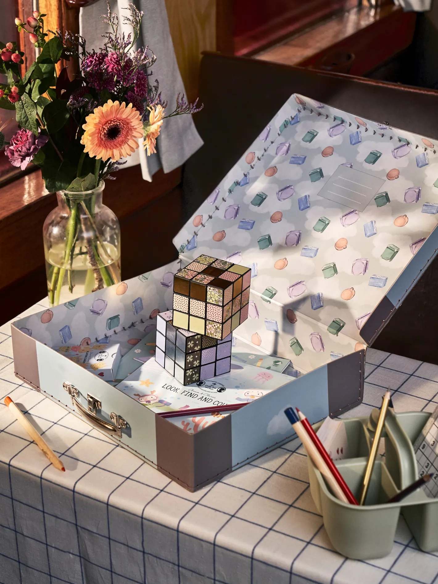 Søstrenes kuffert til børn er lavet af FSC®-certificeret papir med metallås og håndtag. På indersiden har kufferten også et lille navneskilt.