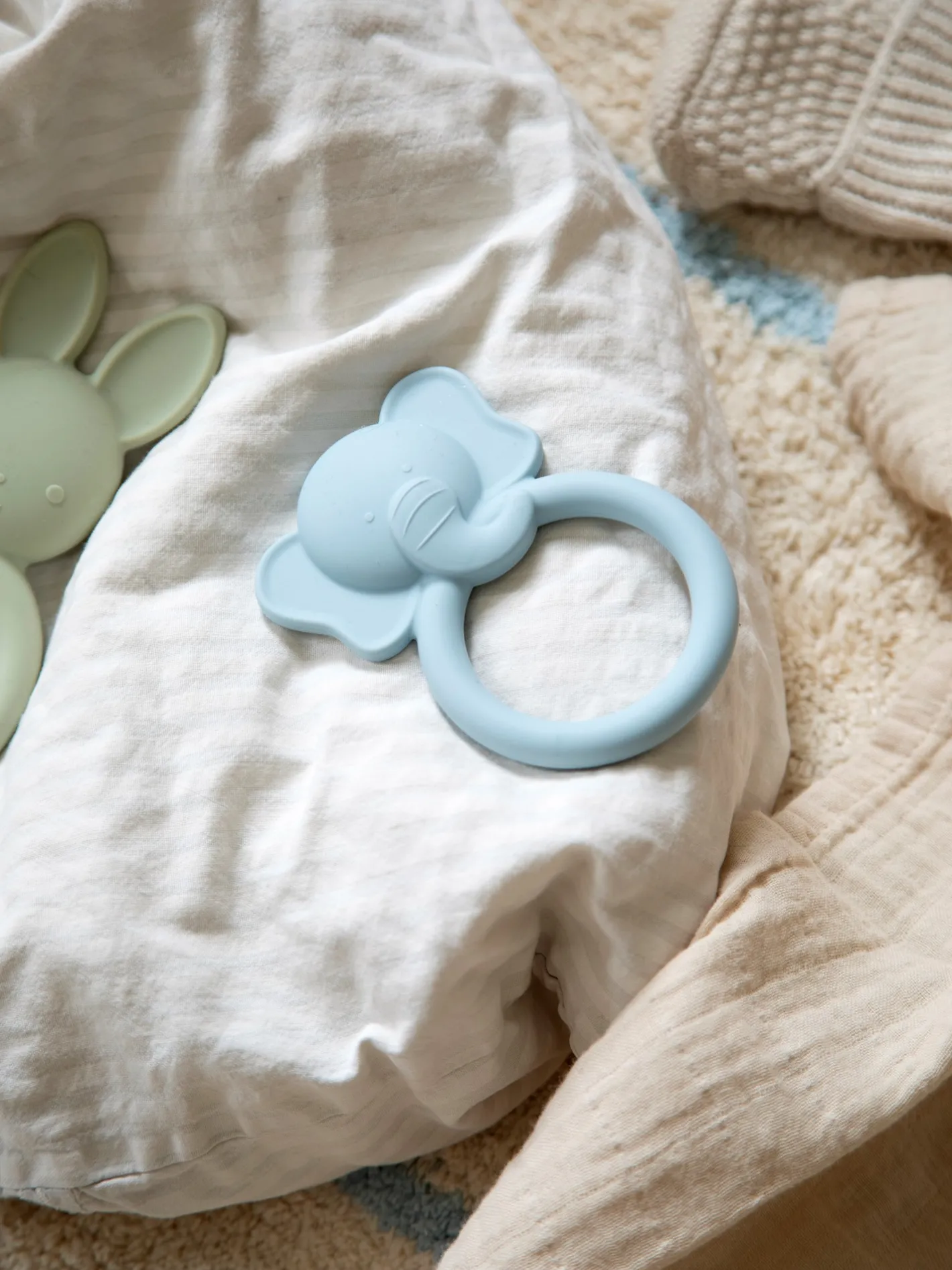 Elefantbideringen fra Mushie er lavet af fødevaregodkendt silikone. Den er perfekt til at hjælpe med at lindre Deres babys irriterede tandkød og kan også hjælpe med at udvikle finmotorik og sensoriske færdigheder. Den anbefalede alder for dette produkt er 3 måneder og opefter.Søstrene anbefaler at rengøre den med varmt sæbevand og lade den lufttørre. Bemærk venligst, at produktet altid skal bruges under opsyn af en voksen. Undersøg produktet før hver brug. Afskaf ved tegn på skade eller svaghed.