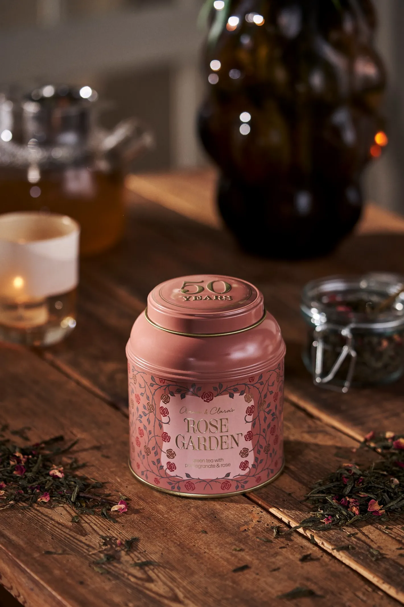 Anna og Claras Rose Garden jubilæumste indeholder 87% grøn te, 5% rosenblade, 5% naturlig granatæblearoma og 3% granatæble. Den kommer i en yndig tedåse på 70 g. Netop denne teopskrift har været i familien i generationer og blev udtænkt af en af Søstrene Grenes grundlæggere. Den deles nu med omverdenen for at fejre 50 år med Søstrene Grene.