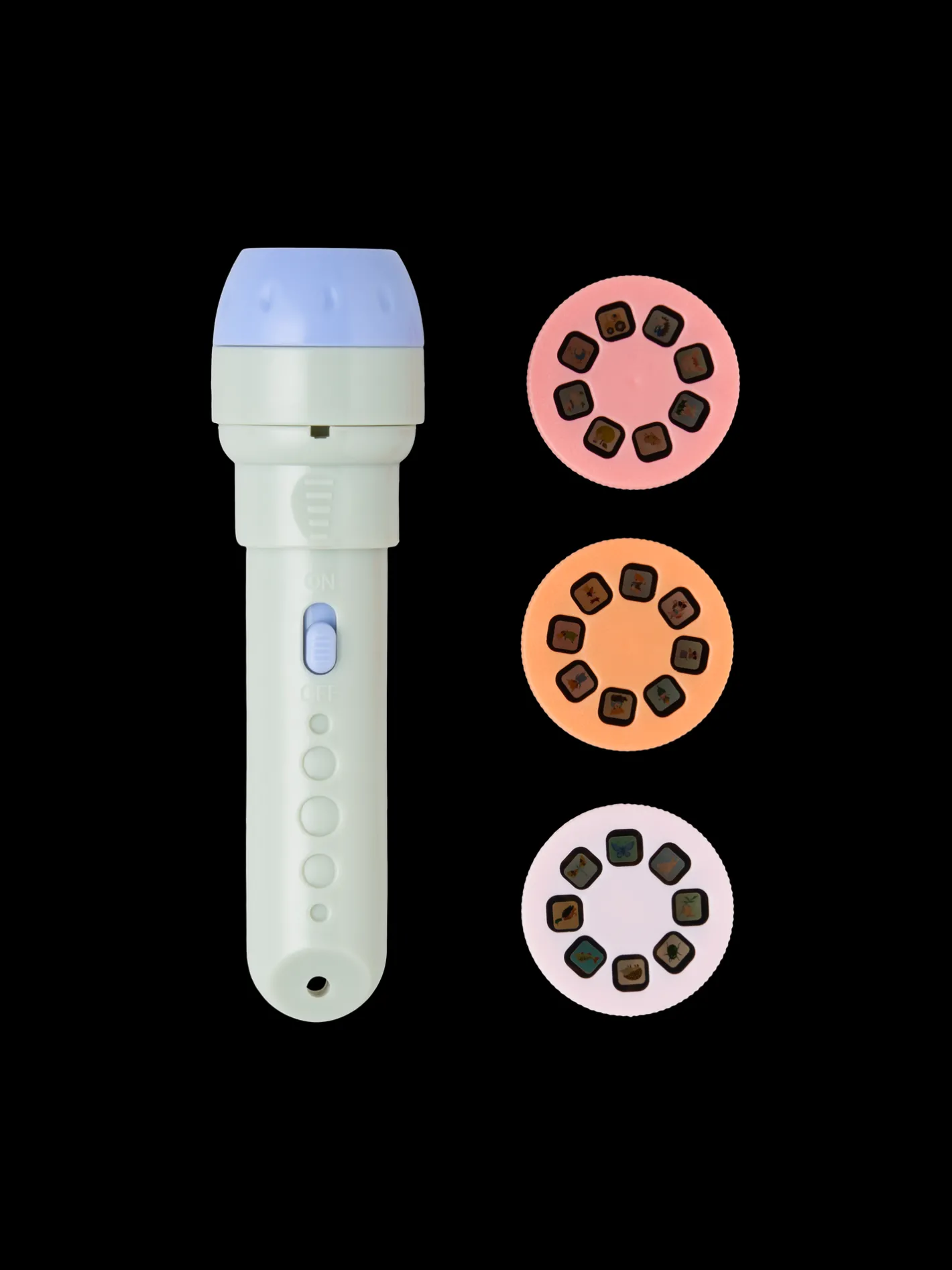 Søstrenes projektorlommelygte kommer med tre billedhjul med 8 forskellige billeder hver.