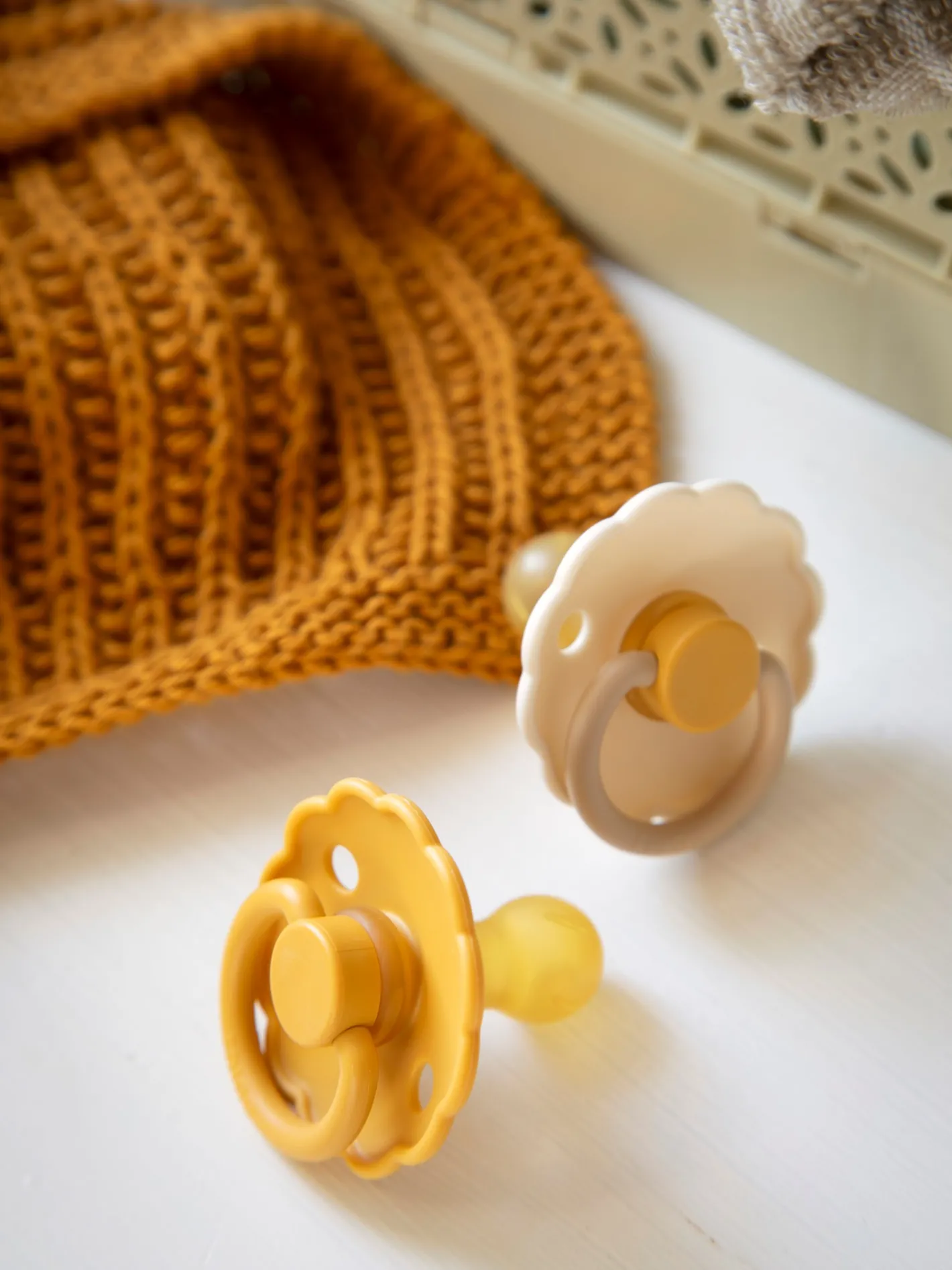 Daisy-sutterne fra det danske mærke FRIGG er designet og produceret i Danmark. Pakken indeholder 2 FRIGG-sutter. Sutterne har låsemekanismen click-lock® og en ny SilkySoft™ overflade. Sutten er lavet af 100% naturgummi og kommer i en størrelse 1, ideel til alderen 0-6 måneder. Sutten er rund og måler 27 mm. Daisy-sutterne fra FRIGG har yndige, flossede kanter, der minder om en særlig blomst: Tusindfryden, som er Danmarks nationalblomst. Denne pakke indeholder en kamillefarvet sut og en Honey Gold-farvet sut. Søstrene gør opmærksom på, at sutterne bør udskiftes hver 4.-8. uge af hygiejniske årsager og for optimal sikkerhed. De bør altid tjekke sutten før brug og kassere den ved første tegn på beskadigelse eller slid.