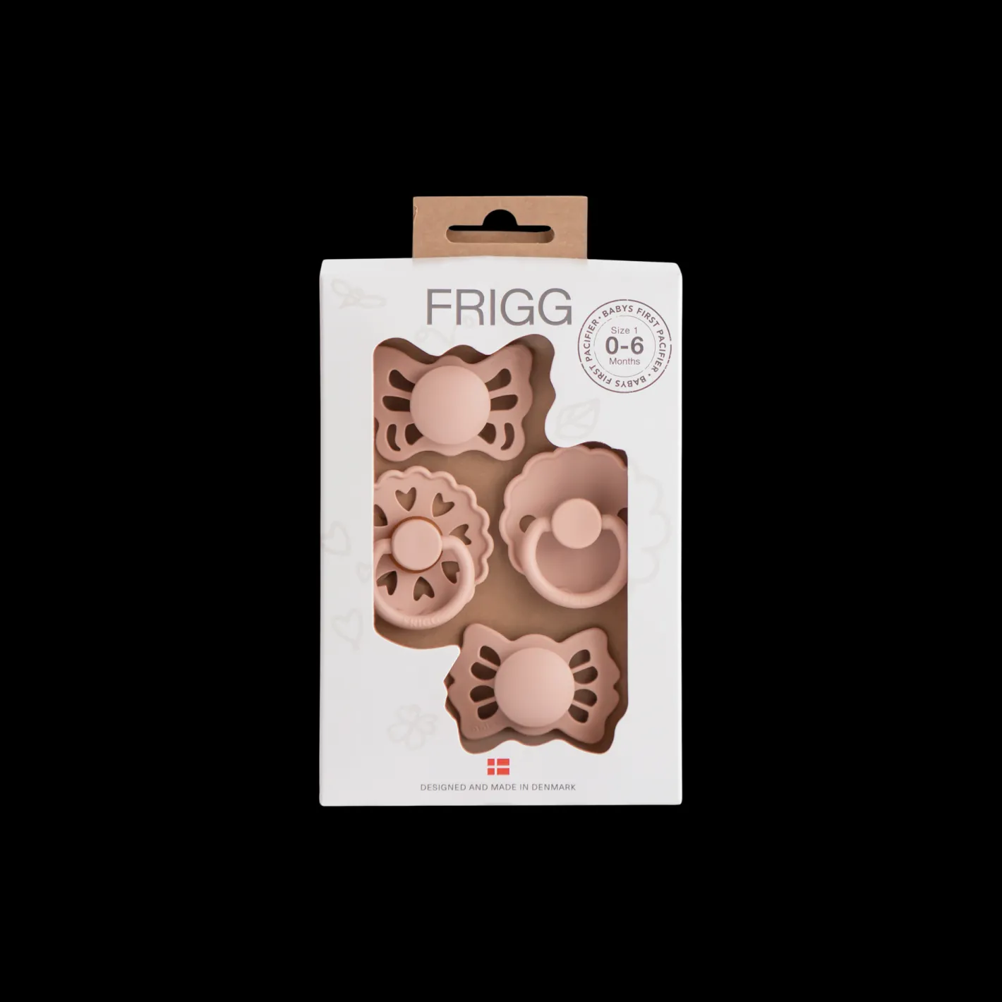 Dette sæt sutter fra det danske mærke FRIGG er designet og produceret i Danmark. Pakken indeholder 4 FRIGG-sutter: • 1 x Butterfly (anatomisk sut lavet af medicinsk silikone)• 1 x Fairytale (rund sut af naturgummi)• 1 x Daisy (rund sut lavet af medicinsk silikone)• 1 x Lucky (symmetrisk sut lavet af medicinsk silikone) Sutterne har låsemekanismen click-lock® og en ny SilkySoft™ overflade. Sættet, der består af 4 forskellige FRIGG-sutter med forskellige materialer og faconer, giver forældre mulighed for at prøve forskellige sutter for at finde ud af, hvilken deres baby bedst kan lide. Alle fire sutter kommer i en størrelse 1, ideel til alderen 0-6 måneder. Søstrene gør opmærksom på, at sutterne bør udskiftes hver 4.-8. uge af hygiejniske årsager og for optimal sikkerhed. De bør altid tjekke sutten før brug og kassere den ved første tegn på beskadigelse eller slid.
