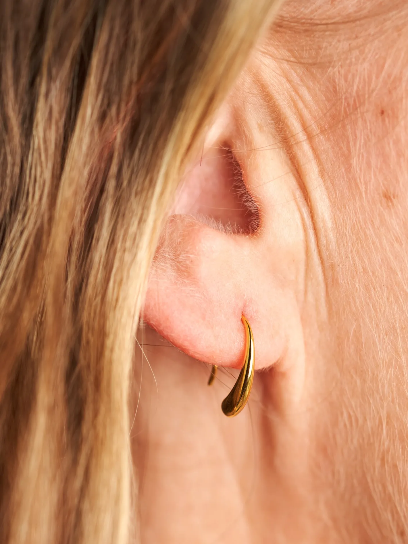 Søstrene gør Dem venligst opmærksom på, at denne vare kun forhandles online. Amy-øreringene er lavet af 925 sterling sølv og forgyldt med 18 karat guld. Disse to øreringe måler 8 x 3 x 14 mm og kommer i en smuk, lille smykkeæske.”Amy-øreringene har en blød, rund facon, hvilket er et nyt strejf til de klassiske creoler,” siger Clara med et smil. “En oplagt tilføjelse til Deres smykkesamling.”Anna og Clara gør Dem venligst opmærksom på, at De bør undgå direkte kontakt med fugt og væske for en længere holdbarhed af guldbelægningen.