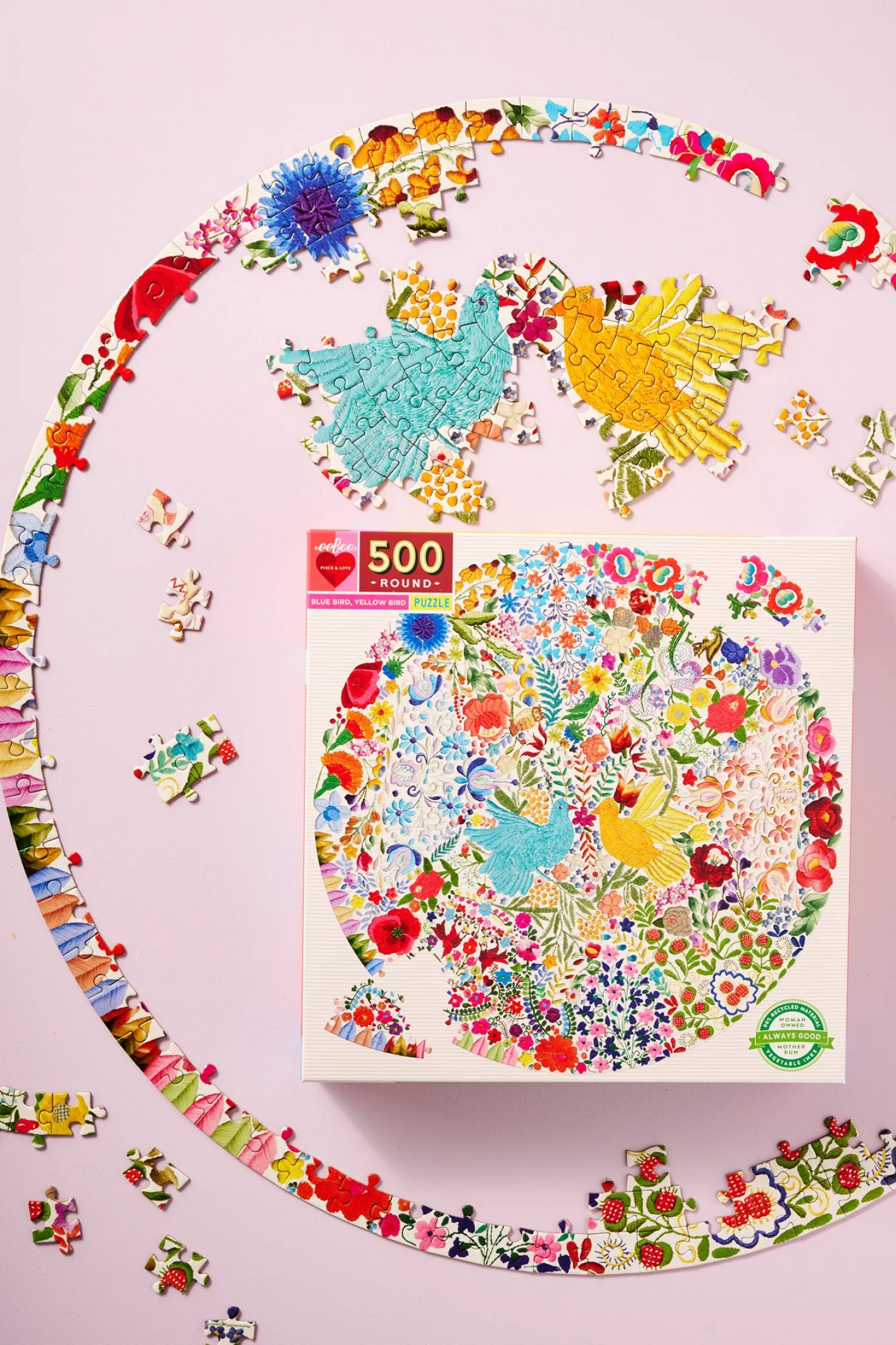 Søstrene gør Dem venligst opmærksom på, at denne vare kun forhandles online.The Blue Birds Yellow Birds-puslespillet fra eeBoo er lavet af papir og måler 58 cm i diameter, når det er samlet. Puslespillet har 500 brikker. Kunstværket er af Fumiha Tanaka.Hvad end de hygger sig indenfor på regnvejrsdage eller sidder på terrassen, når solen skinner, finder Anna og Clara stor fornøjelse i at lægge puslespil sammen. “Det er en beroligende aktivitet, som giver masser af plads til at småsnakke, alt imens man lægger puslespillet,” siger Clara.Hun samler metodisk brikkerne, der danner en ramme om puslespillet, mens Anna forsøger at finde farver og former, der lader til at passe sammen. De har hver deres tilgang til at lægge puslespil, og sammen tilbringer de en eftermiddag, hvor de harmonisk arbejder sammen. “Det er altid en stor glæde, når det endelige resultat afsløres, og man kan fordybe sig i de skønne små detaljer i billedet,” siger Anna med et smil.