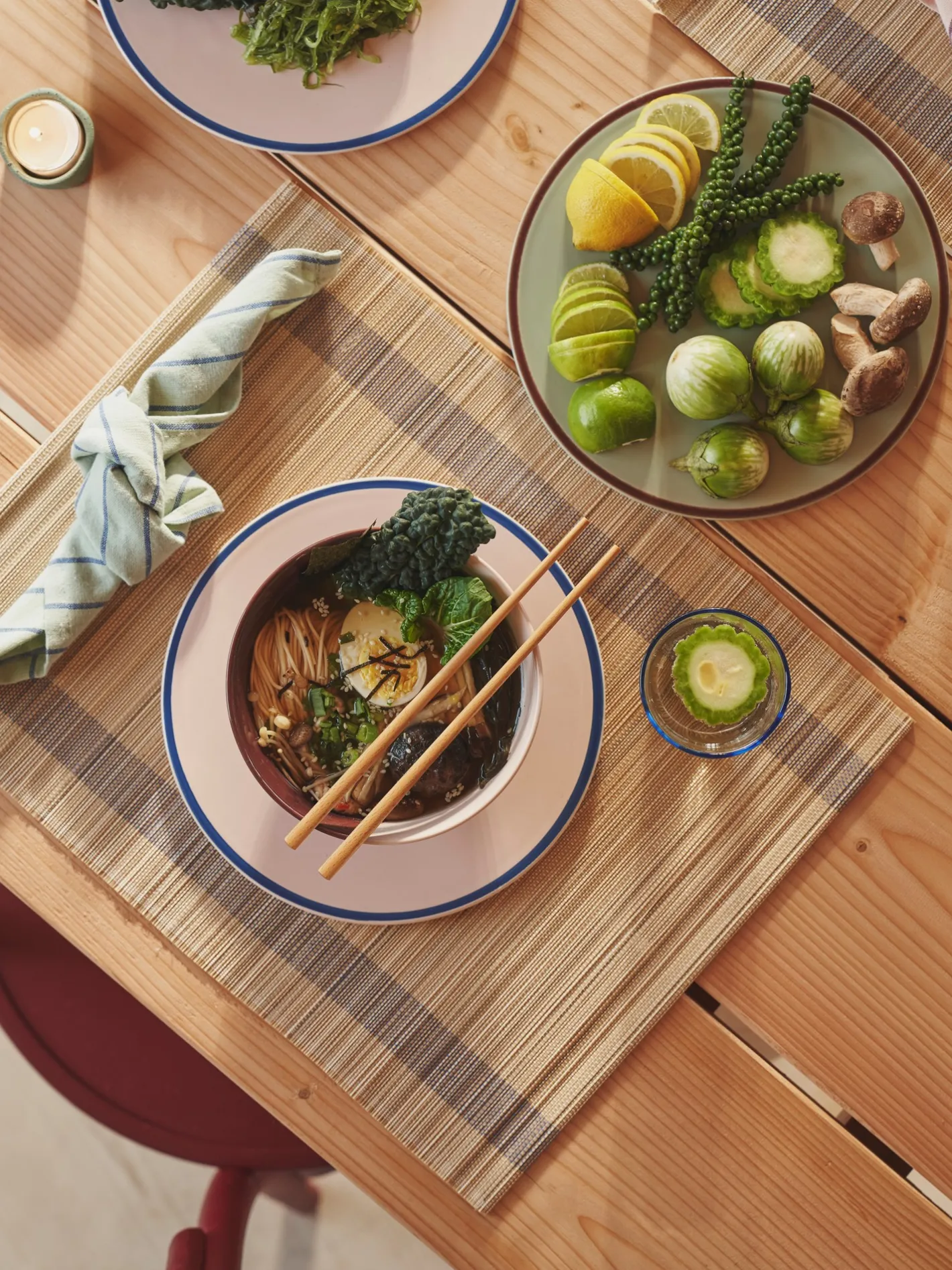 Søstrenes dækkeserviet er lavet af 100 % FSC®-certificeret bambus og måler 45 x 35 cm. Den kan rulles sammen for nem opbevaring efter Deres måltid.
