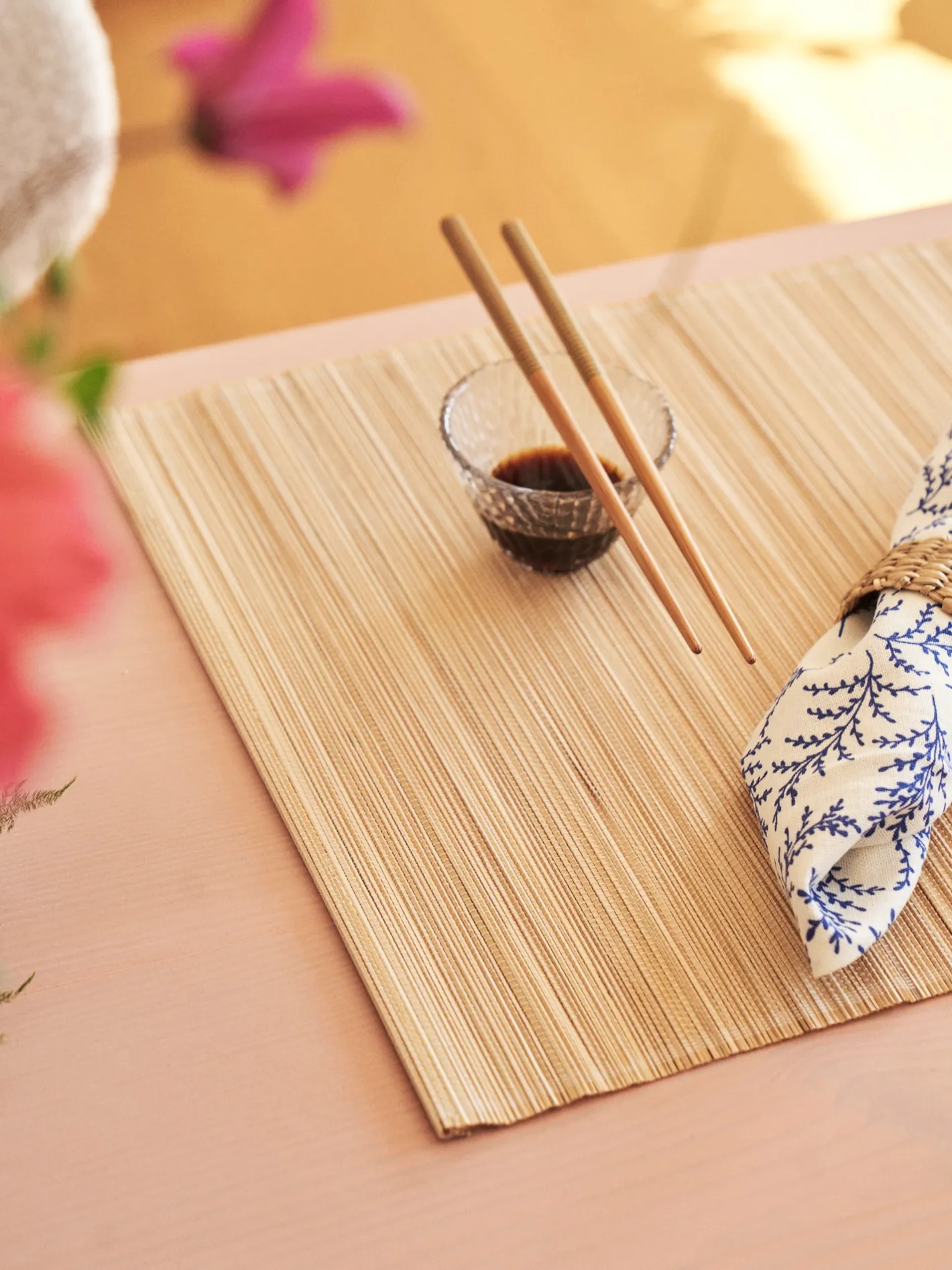 Søstrenes dækkeserviet er lavet af 100 % FSC®-certificeret bambus og måler 45 x 35 cm. Den kan rulles sammen for nem opbevaring efter Deres måltid.
