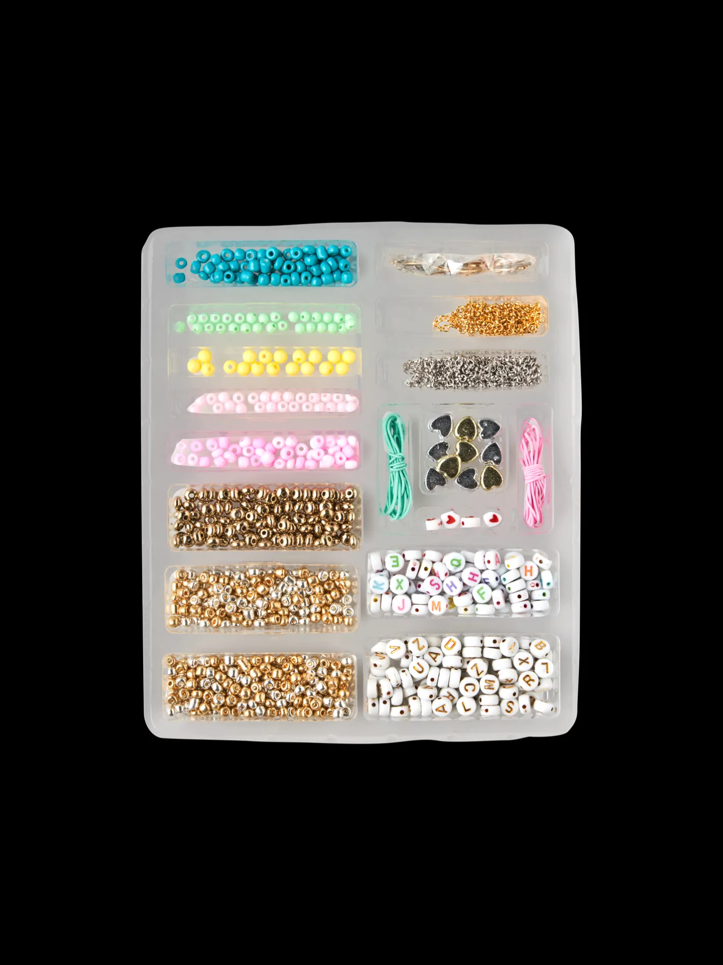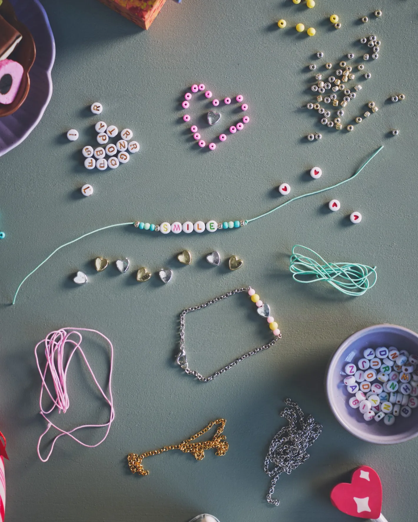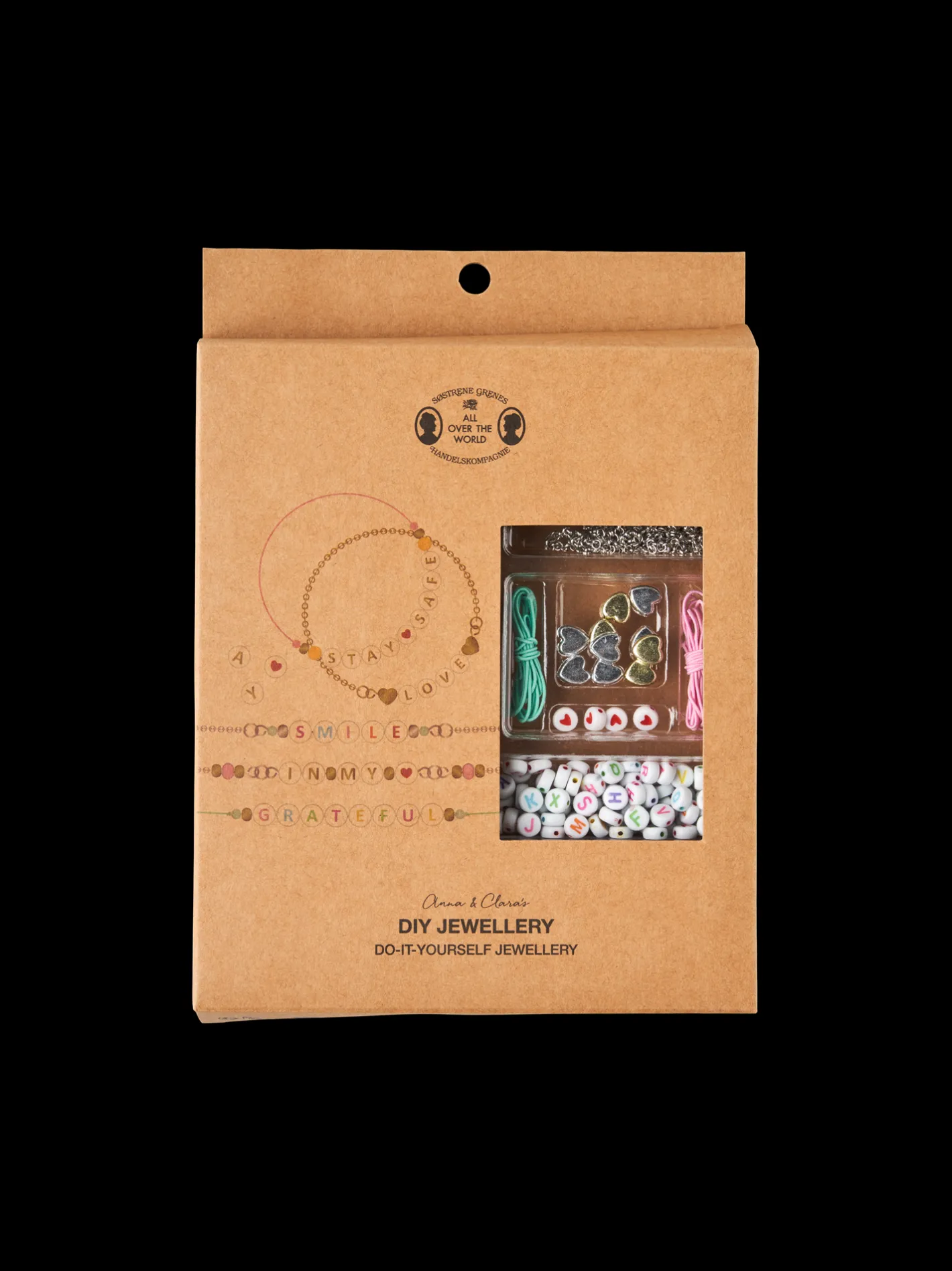Søstrenes DIY-smykkesæt indeholder snore, kæder og forskellige perler til at lave Deres egne armbånd og halskæder med.