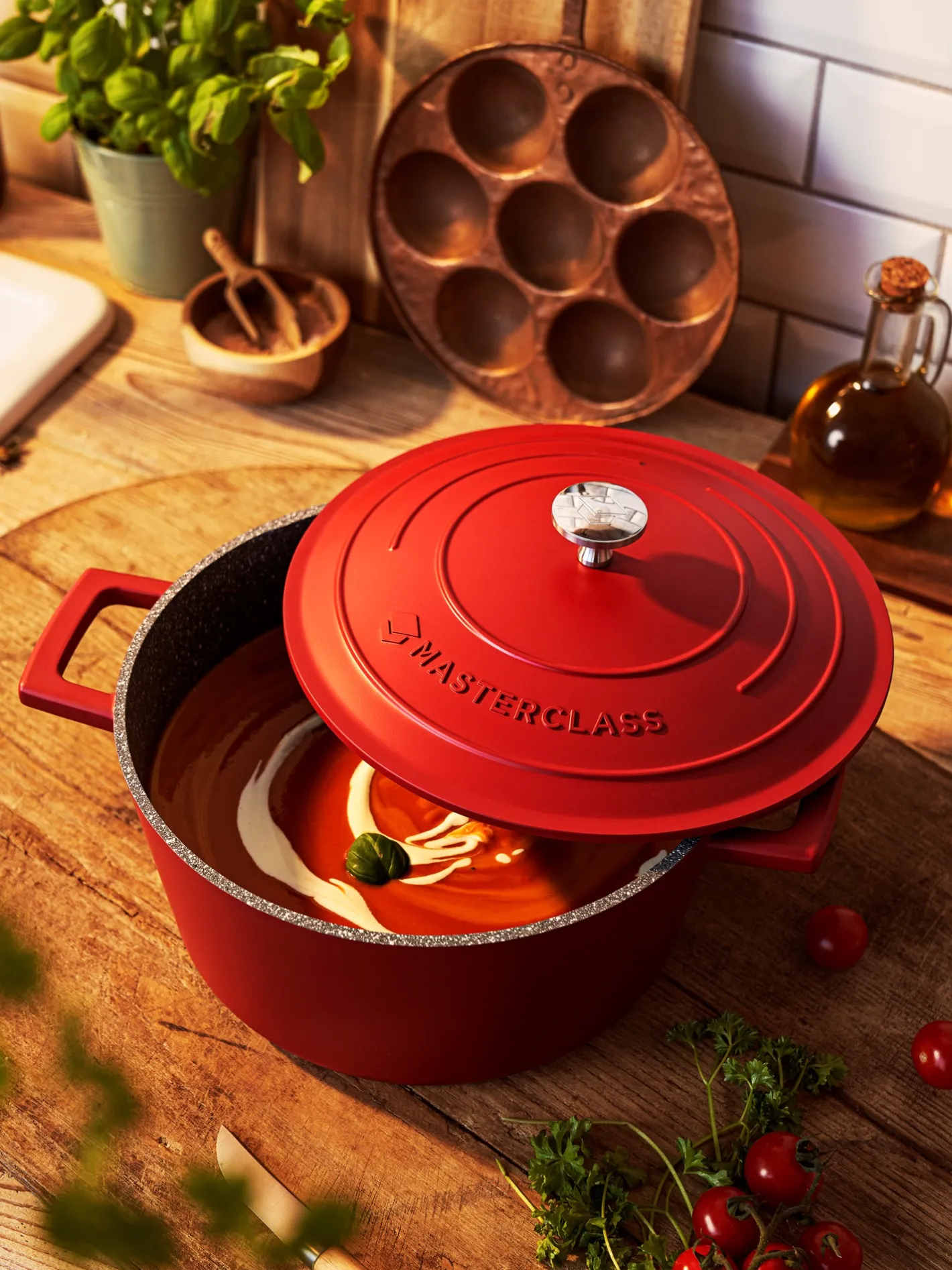 Denne gryde fra MasterClass er lavet af støbt aluminium, et lettere materiale end støbejern, der gør det muligt at tilberede mad hurtigt og jævnt. Den har en kapacitet på 4 liter. Bunden i rustfrit stål gør den nem at bruge på enhver kogeplade, inklusiv induktion, og gryden tåler ovn op til 200 °C. Gryden har et greb og to håndtag samt et låg, der fanger damp som det ophober sig, så madlavningsoplevelsen bliver bedre. Den har en robust ridsefast 2-lagsbelægning, der fungerer som non-stick, hvilket også gør gryden lettere at rengøre. Blandt andet ved at den tåler vaskemaskine.