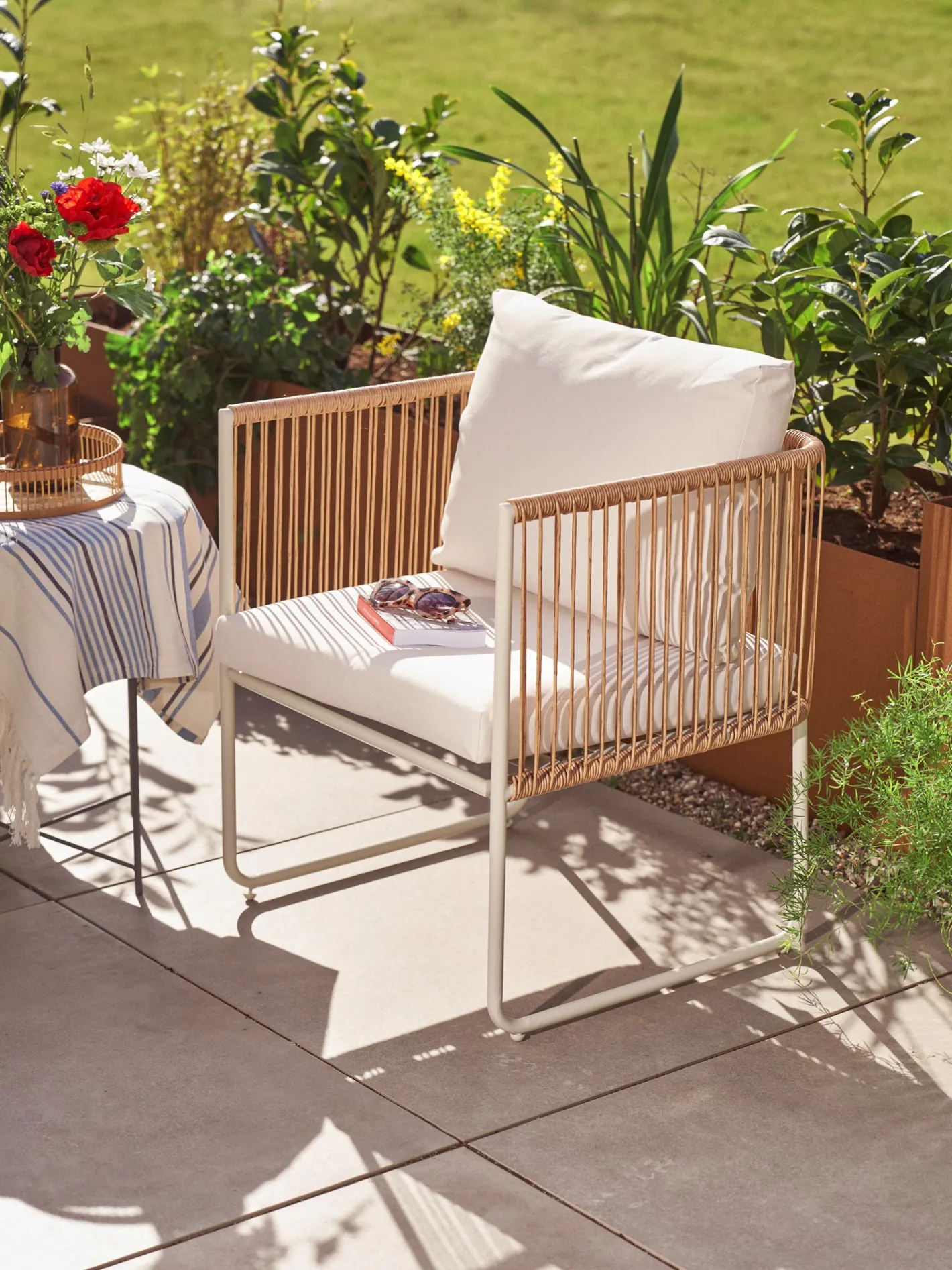 Søstrenes havestol er STANDARD 100 by OEKO-TEX®-certificeret og er et dejligt sted at slå sig ned. Den har en sædehøjde på 40 cm inklusive puden og en sædehøjde på 34 cm uden hynden.
