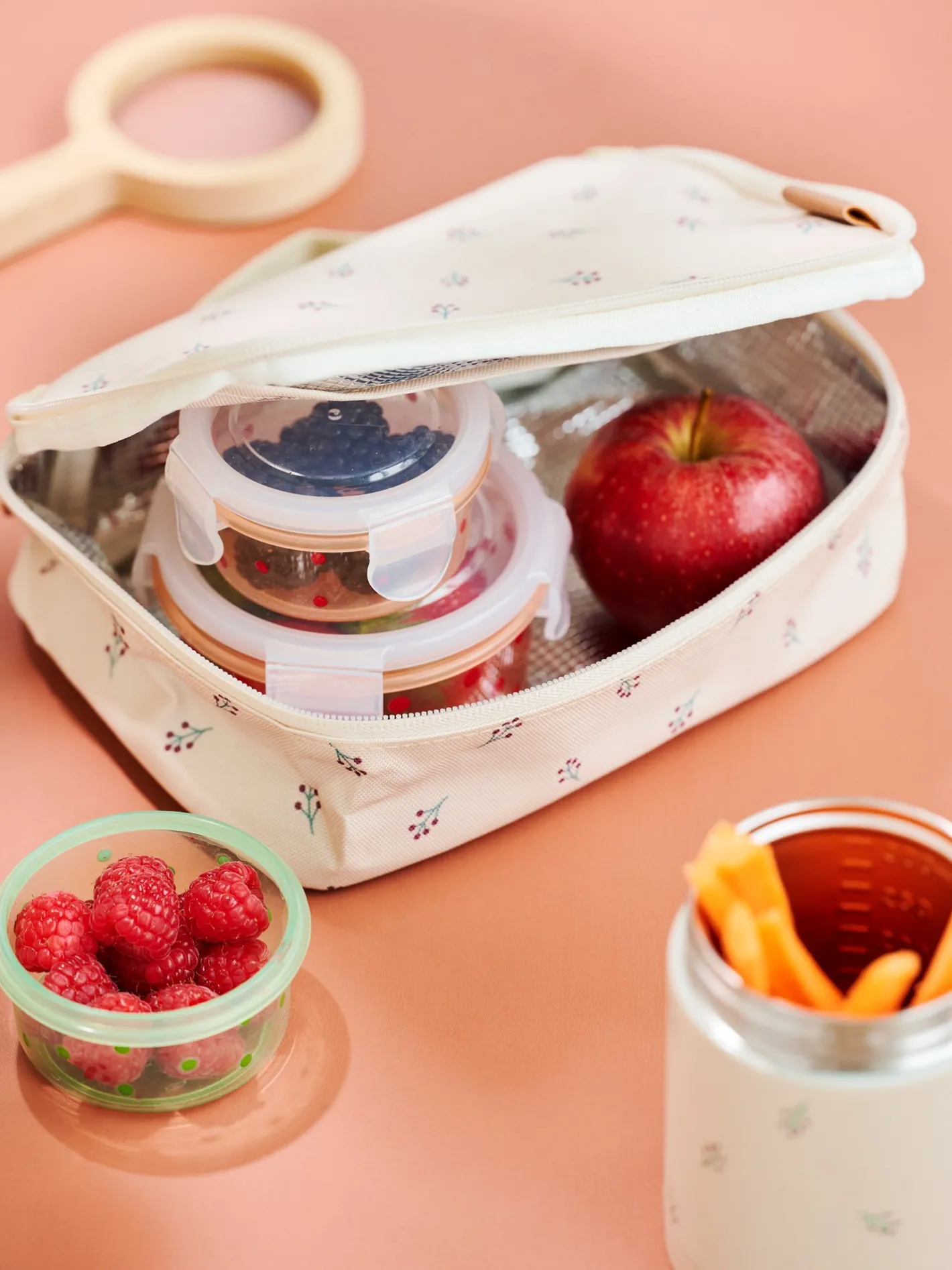 Denne køletaske fra Fresk måler 24 x 7 x 15 cm.Køletasken er isoleret og har en lomme på indersiden til bestik eller en lille snack. Den har et praktisk håndtag på bagsiden, som gør den let at bære.”Medbring Deres yndlingssnacks på en picnic eller pak en lækker frokost til de kære små,” foreslår Clara. “Jeg ynder altid at pakke lidt ekstra, så nevøen kan dele sin mad med sine venner,” tilføjer Anna med et smil.