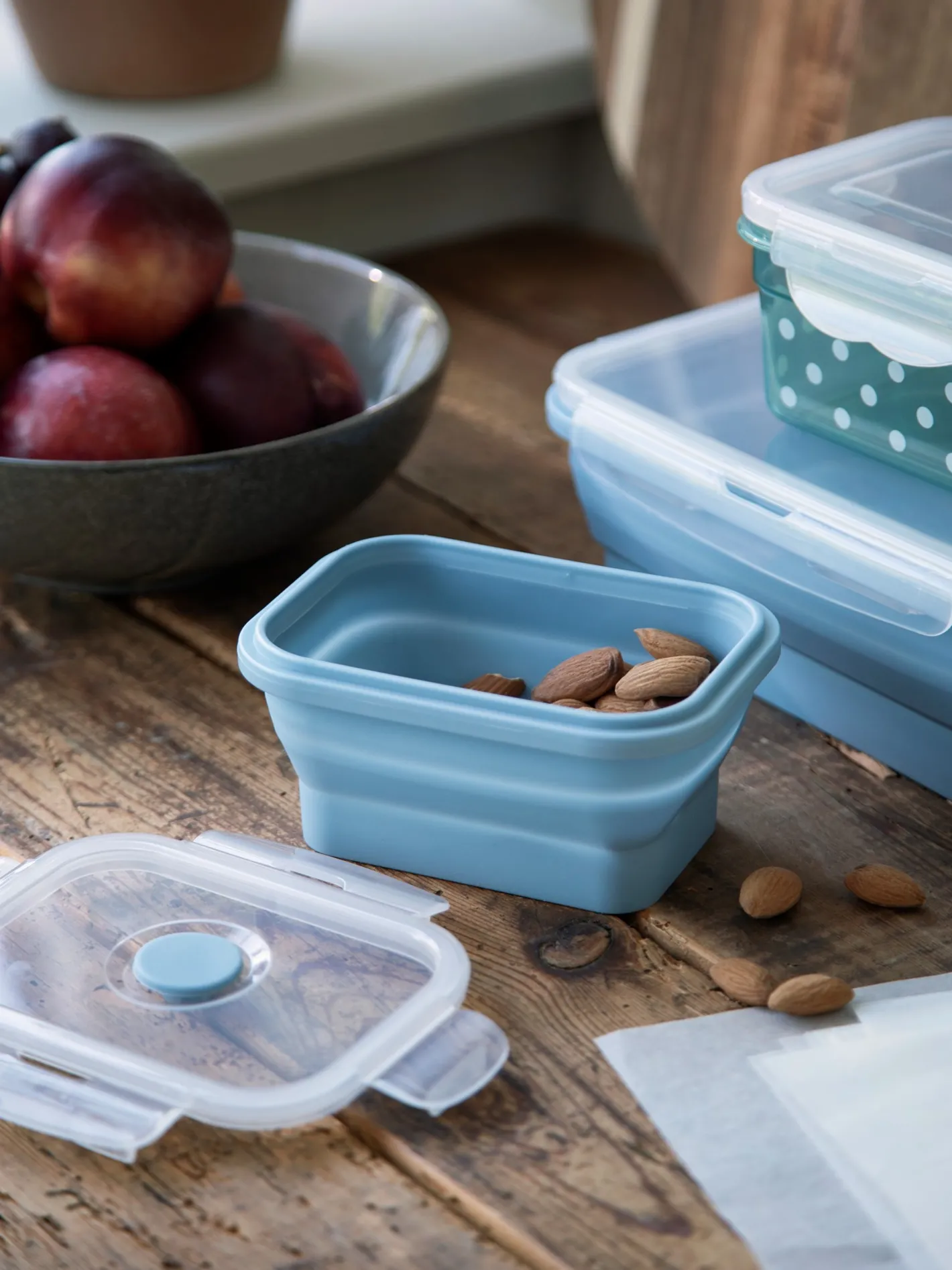Søstrenes madkasse er lavet af silikone og polypropylen. Den kan foldes sammen, så den opbevares let.Beholderen tåler både mikroovn, opvaskemaskine og fryser. Låget tåler dog ikke mikroovn.