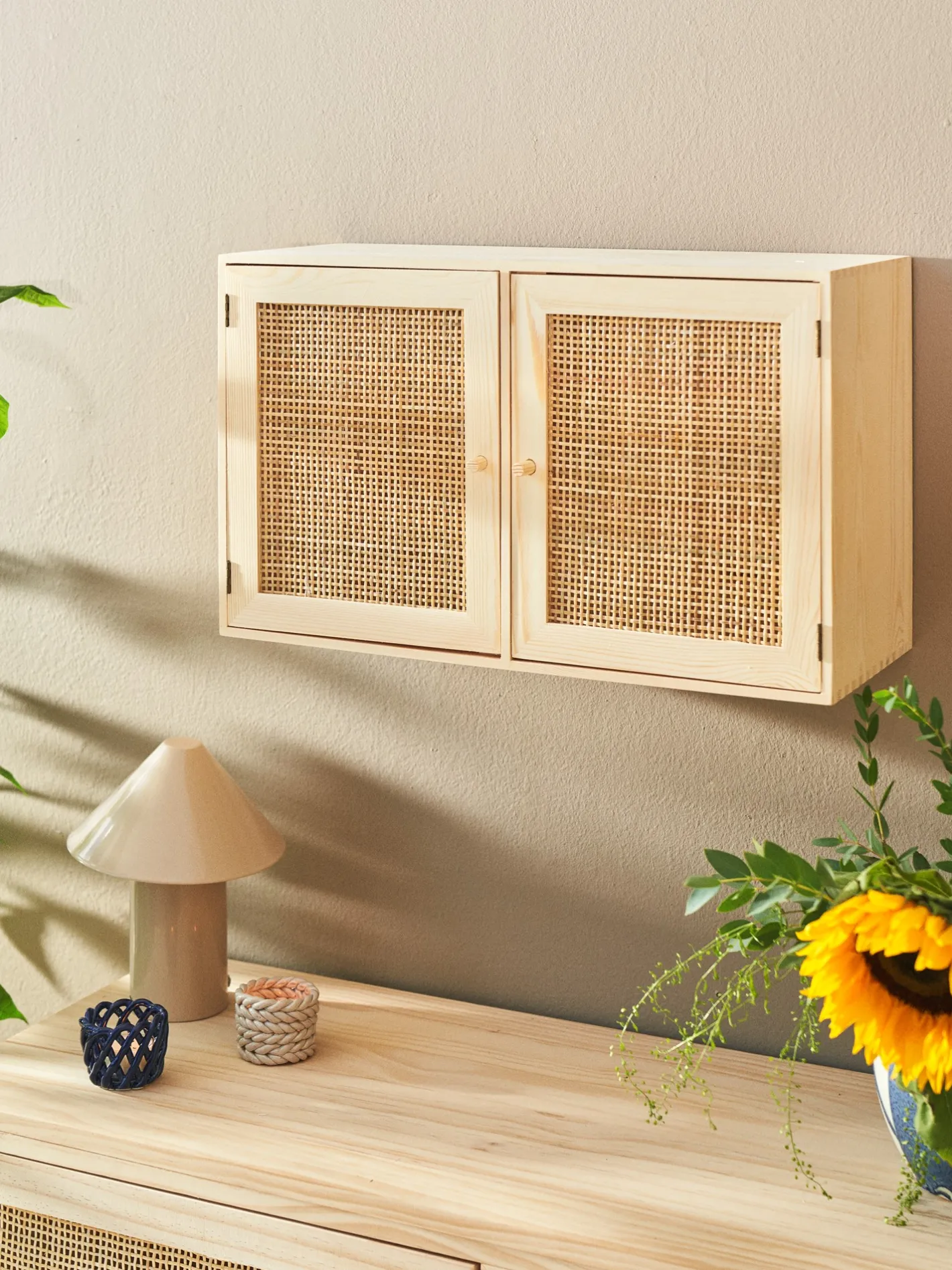 Søstrenes nøgleskab er lavet af FSC®-certificeret fyrretræ, krydsfiner og rattan.