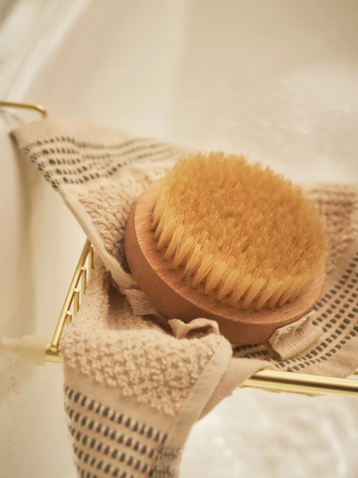 Søstrenes runde kropsbørste er fremstillet af 100% FSC®-certificeret bøgetræ med naturlige børstehår. Den har også en rem for et robust greb.